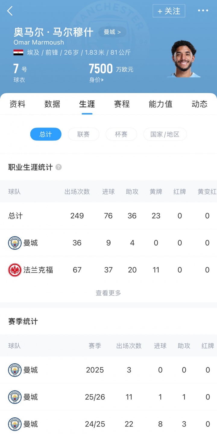 11月29日讯:《The Athletic》最近发表了一篇文章,谈论马尔穆什目前在曼城的困境。埃及前锋本赛季担任哈兰德的替补,在各项赛事出场11次仅打进1球。