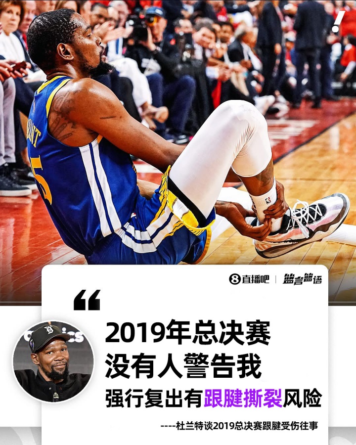 2019年NBA总决赛,效力于勇士队的KD正在与猛龙队争夺总冠军。在此前西部半决赛对阵火箭的系列赛中,杜兰特拉伤小腿,缺席了接下来的西部决赛以及总决赛前四场比赛。勇士队陷入困境,总决赛1-3落后。外界的巨大压力和球队的危急局面共同促成了他G5的翻盘。但第二节比赛,杜兰特在没有对抗的情况下倒地,提前退场。赛后核磁共振检查结果证实,杜兰特右脚跟腱断裂,缺席本赛季。